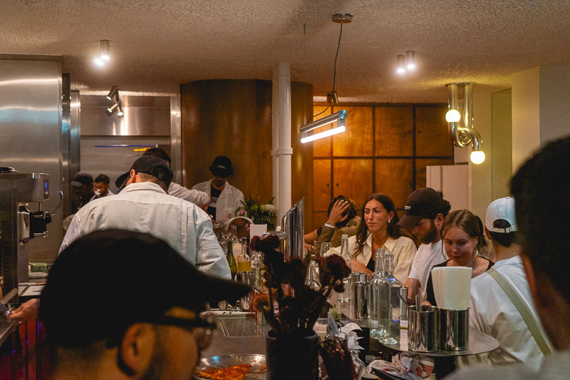 The 70s inspired retro design (red floor and light gloss wood panelling) combined with a uber modern, stainless-style open kitchen makes for a very cool place to dine in. There’s a small terrace for eating outside during the summer months too.